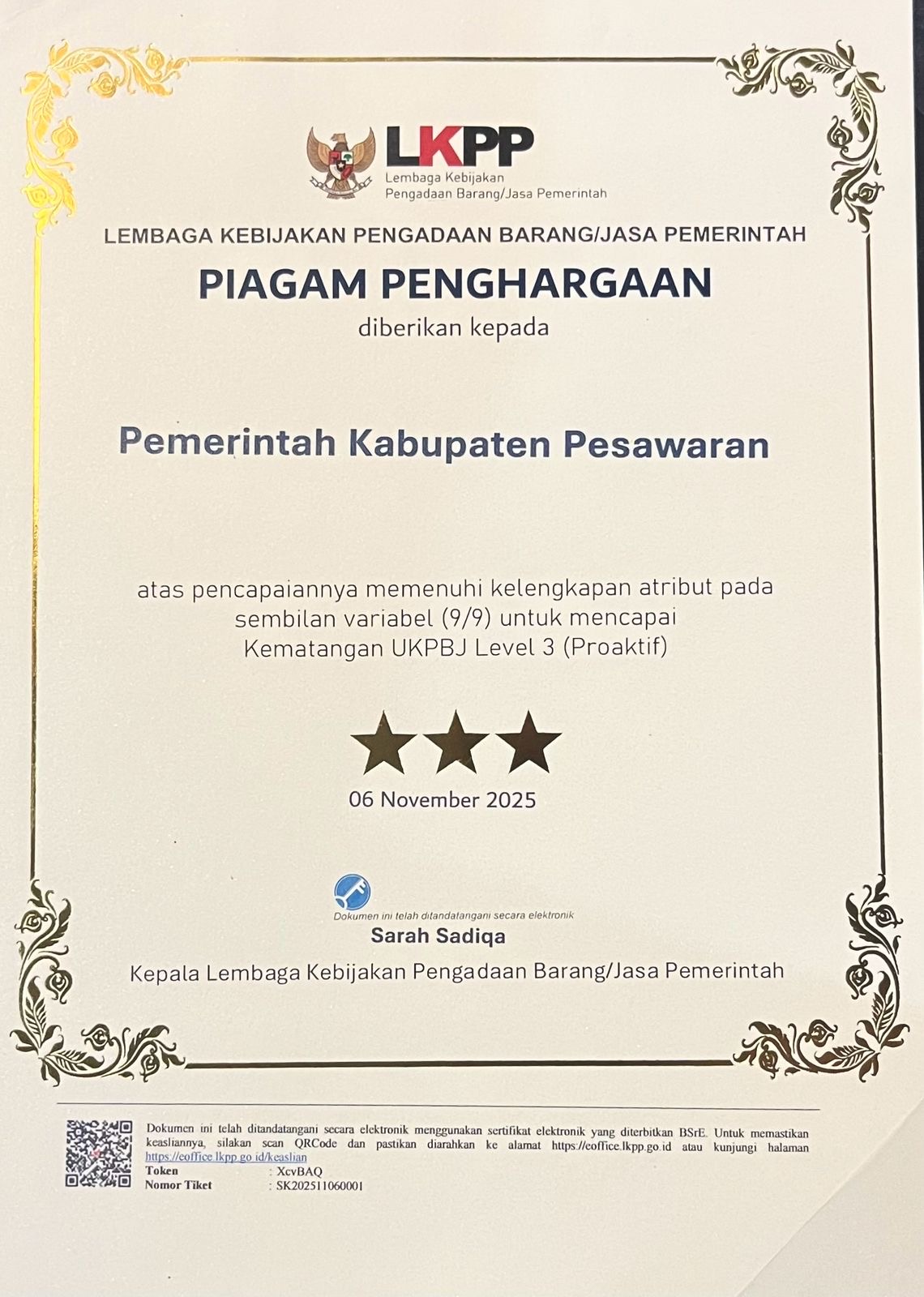 Bukti Komitmen Tata Kelola Transparan, Pemkab Pesawaran Raih Penghargaan UKPBJ Proaktif Level Tiga.